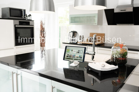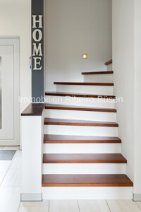 Die Rollläden der weißen Kunststofffenster sind einzeln programmierbar. Im gesamten Haus liegt eine Fußbodenheizung, die für jeden Raum individuell angesteuert werden kann. Als Hauptwärmeerzeuger dient eine Gaszentralheizung, die geschickt mit Solarthermie-Elementen auf dem Dach und mit einem wasserführenden Kaminofen im Wohnbereich kombiniert wurde. Hieraus ergibt sich in jeder Jahreszeit ein energetisch sehr effizientes und nachhaltiges Heizkonzept. Des Weiteren ist dieses Haus mit einer Photovoltaikanlage nebst Batteriespeicher und Wallbox ausgestattet. Die Details zur Haustechnik, weitere interessante technische Raffinessen und Ausstattungshighlights erläutern wir Ihnen sehr gerne im persönlichen Gespräch.