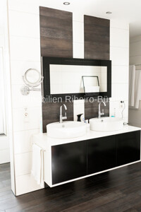 Das große Tageslichtbad im Obergeschoss verfügt neben zwei Waschtischen und einem WC über einen geräumigen und ebenerdig zugänglichen Duschbereich.