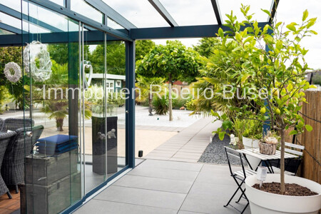 Auch der Garten des insgesamt 659 m² umfassenden Grundstücks setzt die Geradlinigkeit der Architektur mit Zen-Elementen ansprechend um. In der luftig und leichten Alu-Glaskonstruktion des Sommergartens genießen Sie auch an kühlen Tagen die schöne Aussicht.