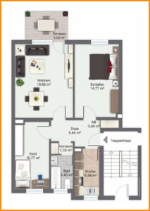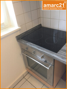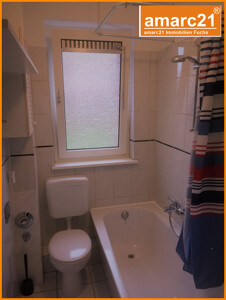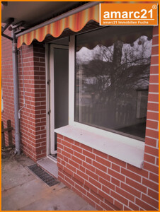 Die Wohnung ist sehr gut aufgeteilt und besteht aus drei Zimmern, Küche mit Einbauküche, Bad mit Fenster, Flur, kleiner Abstellraum und einer von der Straße kaum einsehbaren Terrasse mit Markise. Das Badezimmer ist mit Badewanne, Waschtisch und WC ausgestattet. Zur Wohnung gehören ein Abstellraum