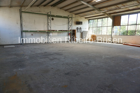 Sowohl vom Bürotrakt aus als auch über die Außenfläche ist die angrenzende Lagerhalle erreichbar – Letzteres auch problemlos mit Lieferfahrzeugen. Die Halle ist mit einem robusten Betonboden ausgestattet und verfügt über zwei große Zufahrtstore: eines im vorderen Bereich mit einer Breite von ca. 3,7 m sowie ein weiteres im hinteren Bereich mit ca. 3,4 m Breite. Beide Tore bieten eine Durchfahrtshöhe von ca. 3,2 m. Die Halle selbst ist nicht beheizt.